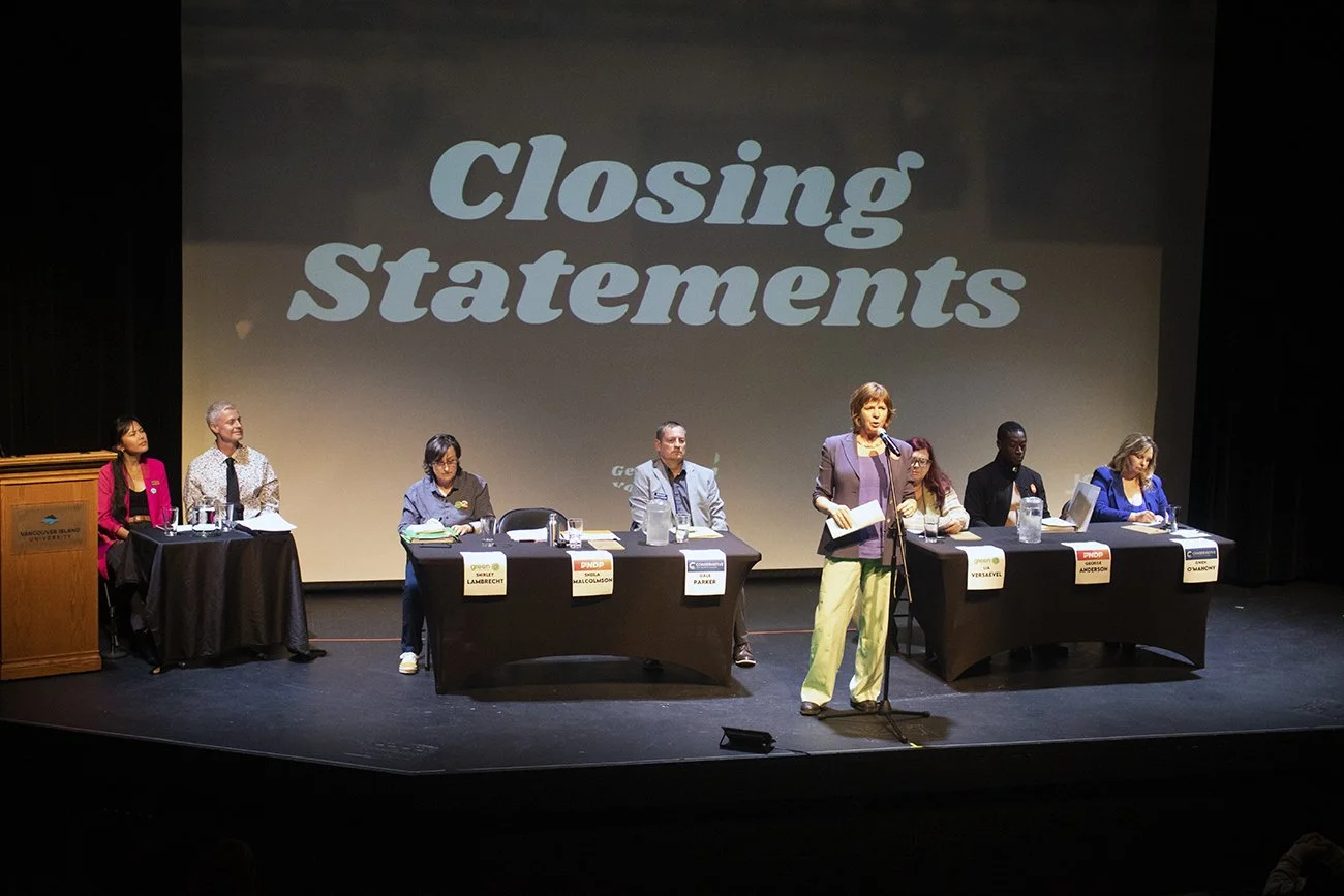 Candidates from the Nanaimo-Gabriola Island and Nanaimo-Lantzville ridings took to the stage of the Malaspina Theatre at Vancouver Island University to answer questions important to post-secondary students.