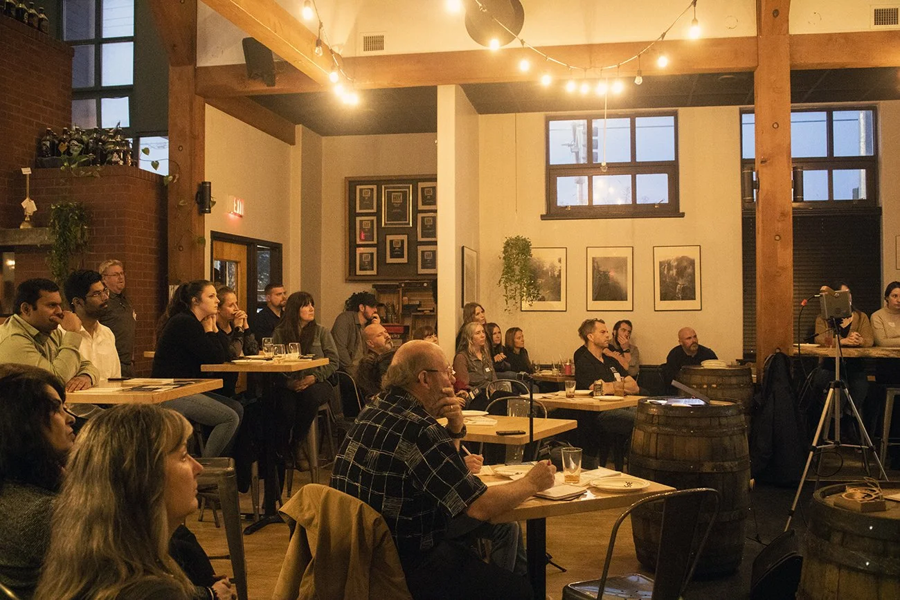 Tuesday, November 5th was the first inaugural BMEx Challenge at the brewery. With the lights set low around 50 people shared drinks and thoughts while eagerly waiting to hear the pitches for the night. Audience members came from different areas of the building sector: contracting, design, manufacturing, waste management, finance, government, academia, and deconstruction.