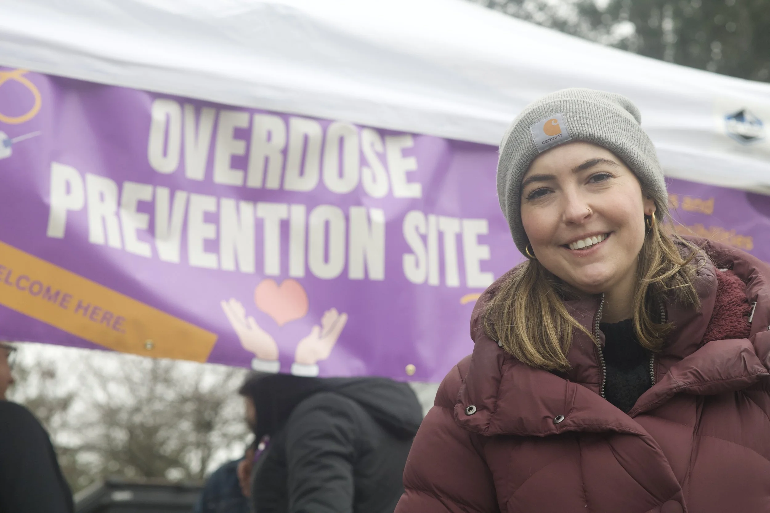 Dr. Jessica Wilder stands in front of the pop up overdose prevention site erected this week across the street from Nanaimo Regional General Hospital. (Joe Pugh/CHLY)